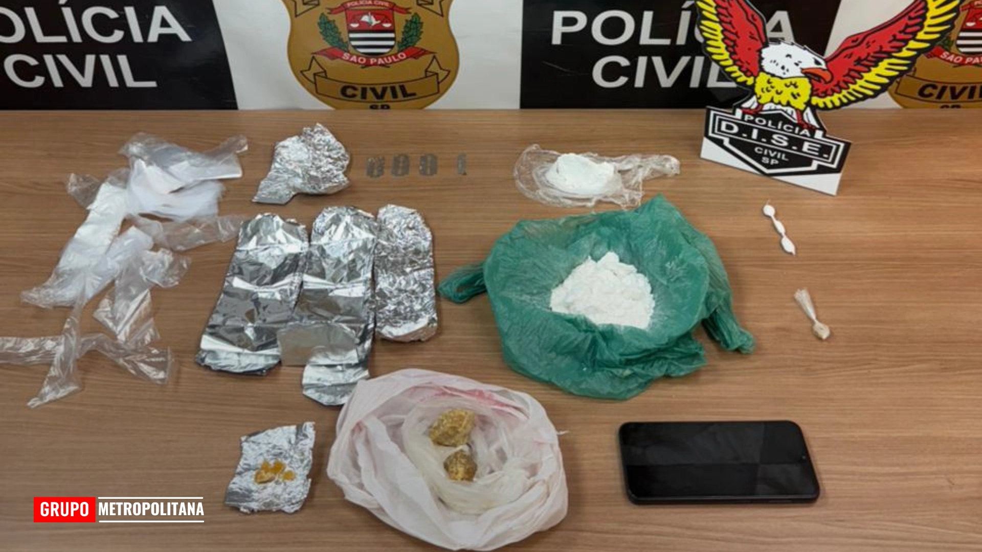 Durante a ação, os policiais apreenderam porções de cocaína e crack, além de materiais usados para preparar e embalar as drogas. Parte do entorpecente já estava pronta para a venda.